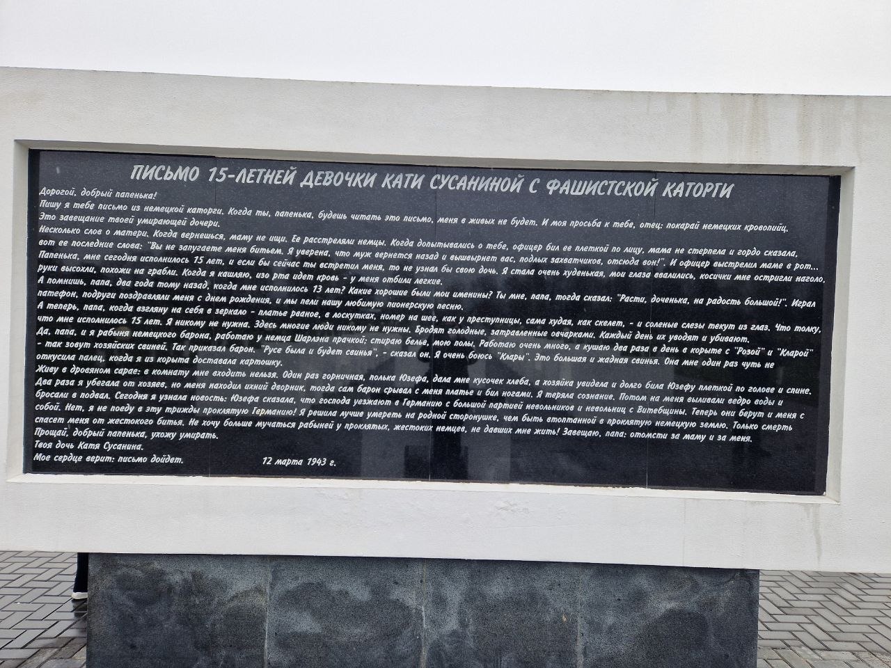 Наша память - залог того, что подобное никогда не должно повториться. Потому что мы белорусы - мирные люди, а Беларусь наш общий дом, наши предки отстояли его в жестоких боях, возродили из руин и пепла и, как бесценное сокровище, передали нам.